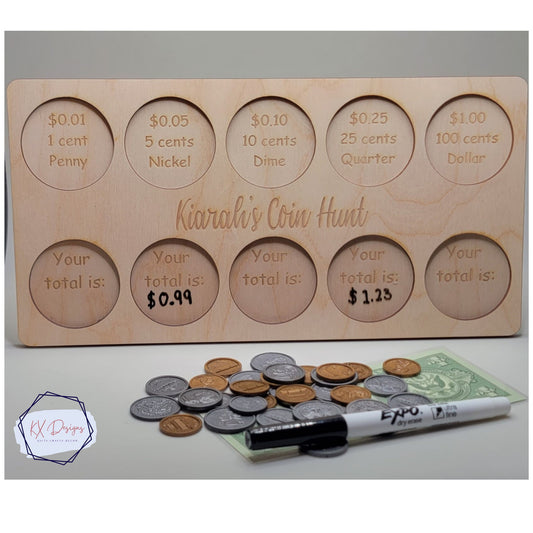 Coin Hunt Custom Gift for Kids, U.S. Coin sorting, Wooden Hands-on Montessori Learning Board, Early Math, Money skills, learn through play